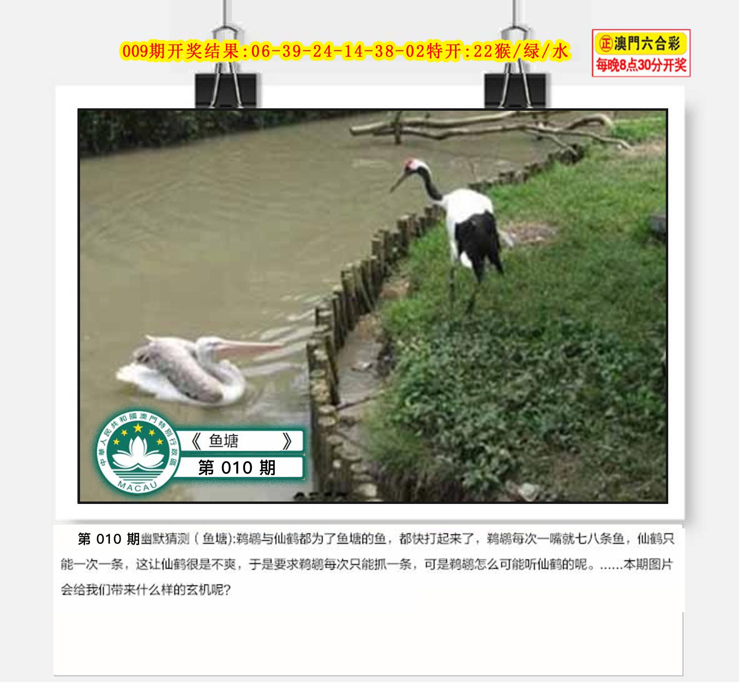 鹈鹕与仙鹤都为了鱼塘的鱼,都快打起来了,鹈鹕每次一嘴就七八条鱼,仙鹤只能一次一条,这让仙鹤很是不爽,于是要求鹈鹕每次只能抓一条,可是鹈鹕怎么可能听仙鹤的呢......本期图片会给我们带来什么样的玄机呢?